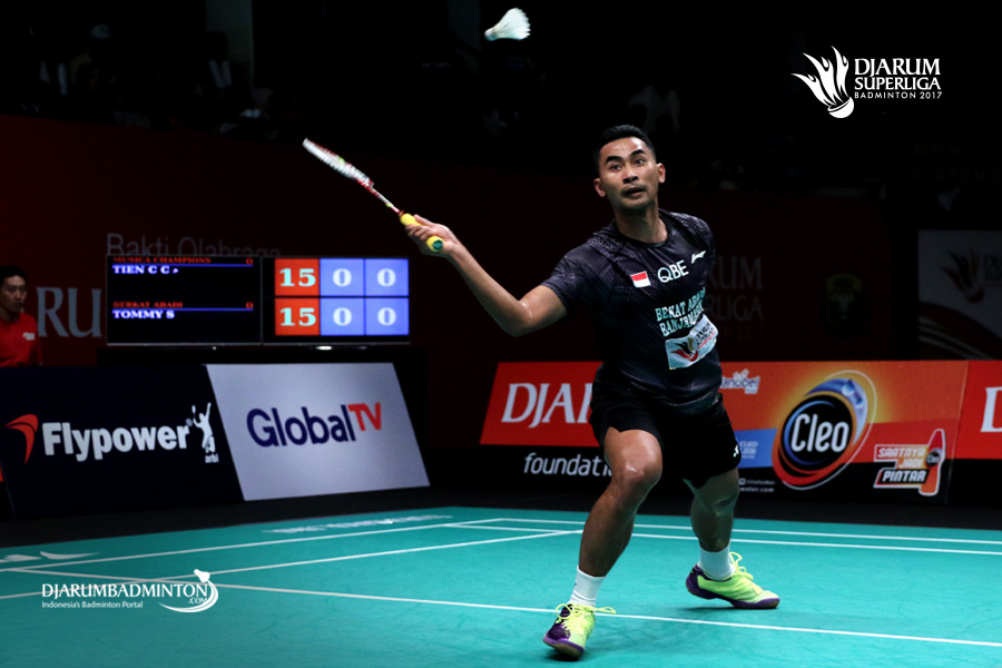 Tommy Sugiarto (PB Berkat Abadi) melepaskan smash.