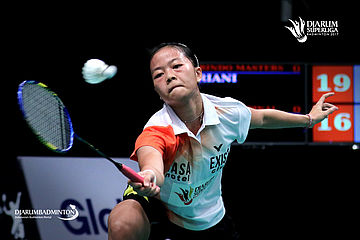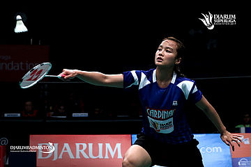 Fitriani (PB Tjakrindo Masters) mengembalikan shuttlecock.