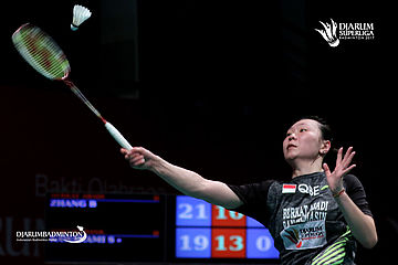 Zhang Beiwen (PB Berkat Abadi) mengembalikan shuttlecock.