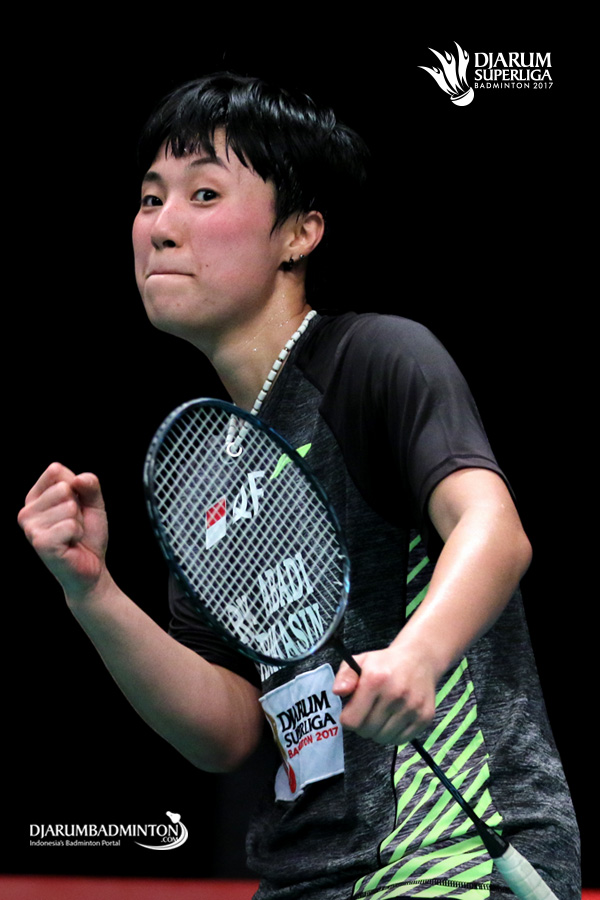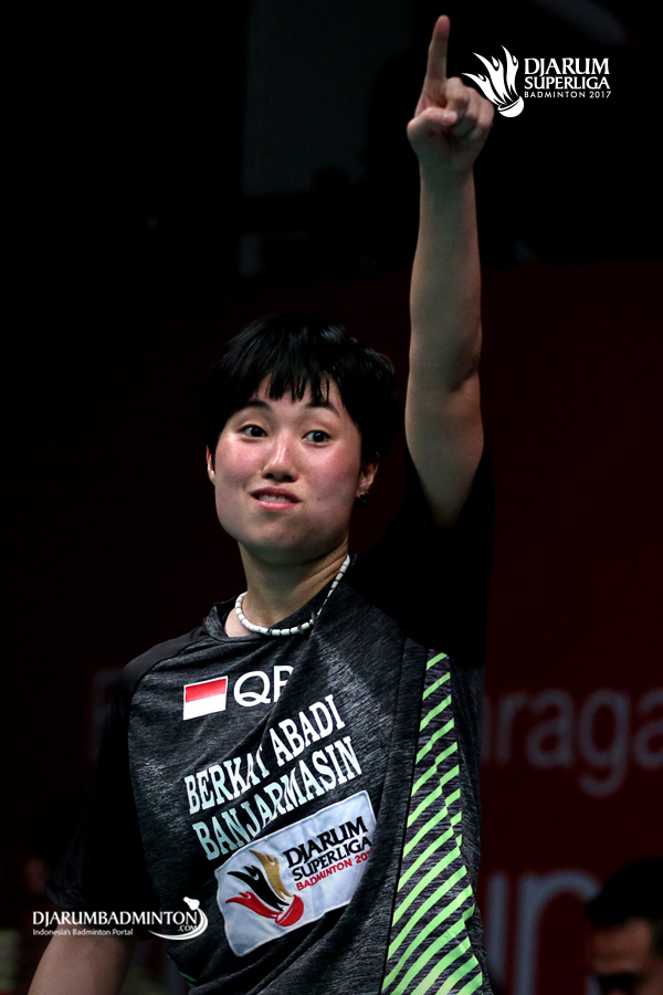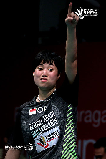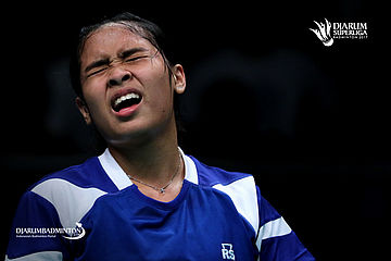 Ekspresi kekecewaan Gregoria Mariska (PB Mutiara Cardinal).