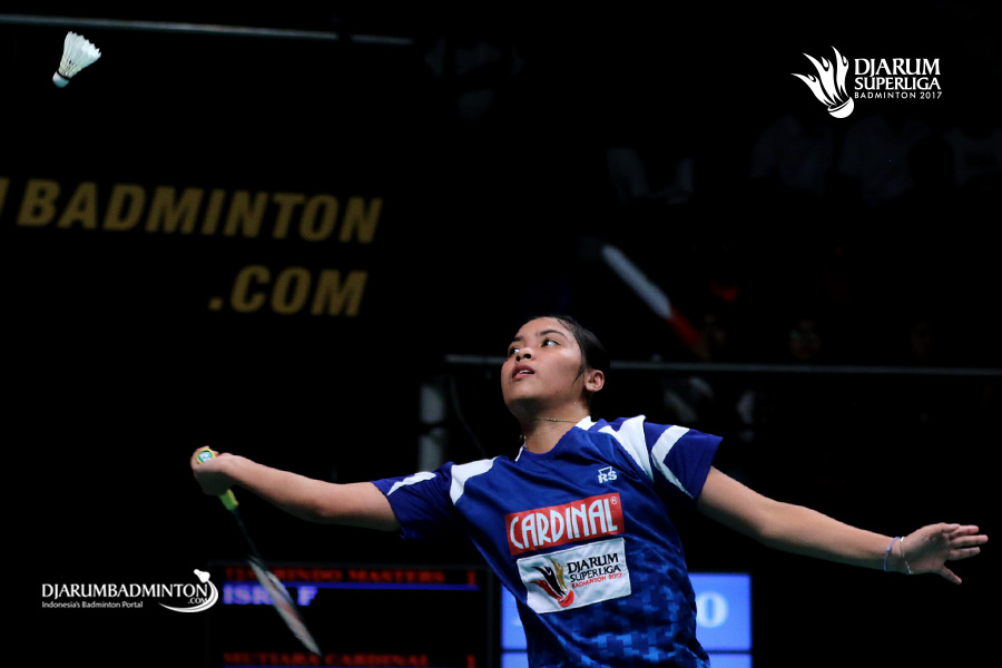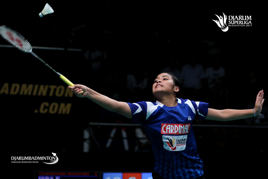 Gregoria Mariska (PB Mutiara Cardinal) menyambut pengembalian.