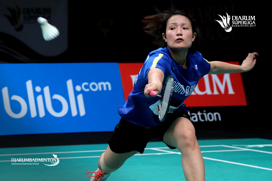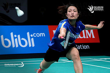 Nagata Rei (Hokuto Bank Jepang) mengembalikan shuttlecock.