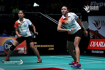 Nisak Puji Lestari/Tiara Rosalia (PB Mutiara Cardinal) mengembalikan shuttlecock.