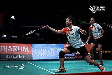Meirisa Cindy/Ni Ketut Mahadewi (Tjakrindo Masters) mengembalikan shuttlecock.