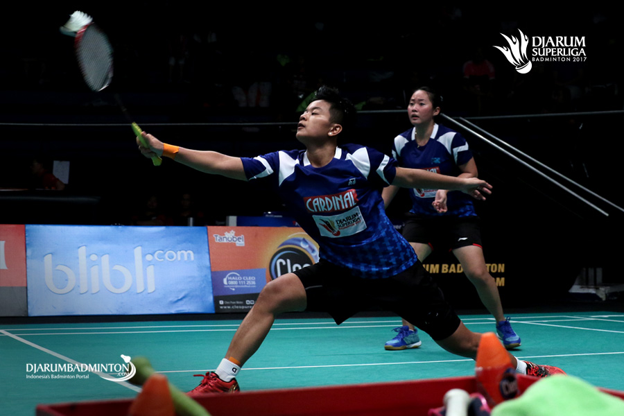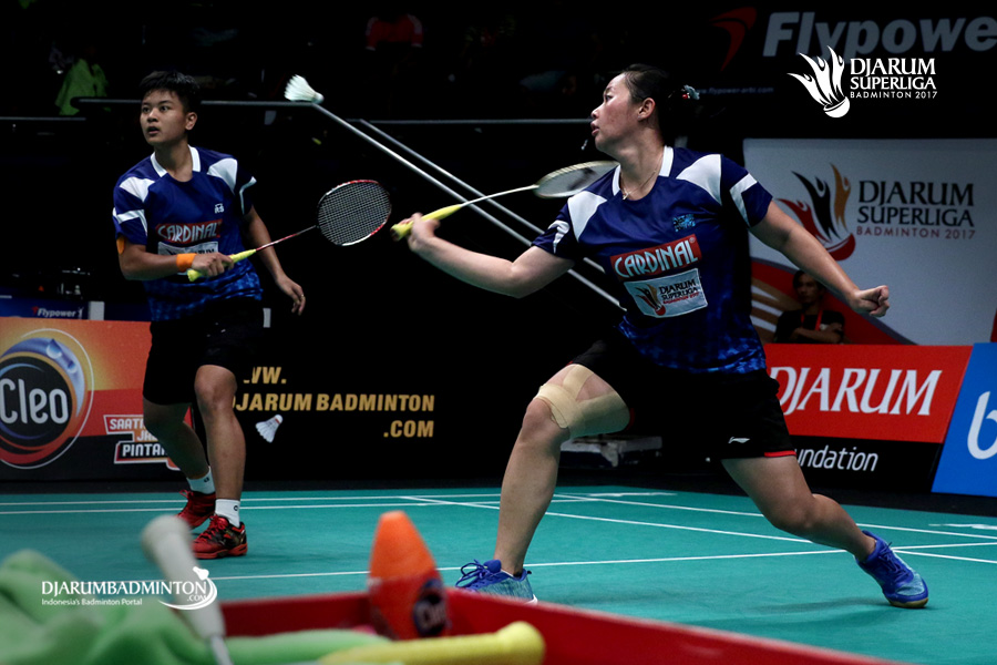 Nisak Puji Lestari/Tiara Rosalia (PB Mutiara Cardinal) bersiap menghadang serangan.