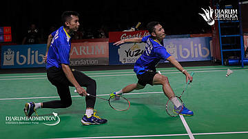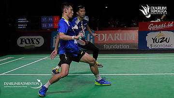 Hendra Setiawan/Marcus Fernaldi Gideon (Jaya Raya Jakarta) menahan serangan