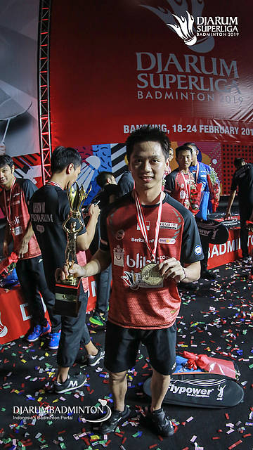 Kevin Sanjaya SUKAMULJO (DJARUM KUDUS) berfoto dengan piala dan medali