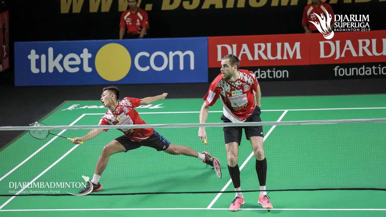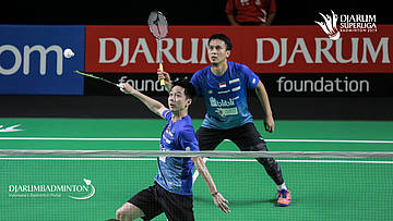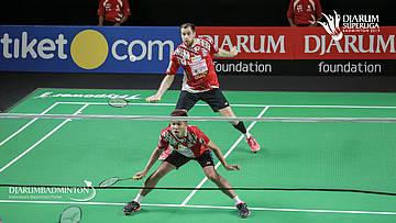 Kevin Sanjaya SUKAMULJO+Mohammad AHSAN (DJARUM KUDUS) mengembalikan shuttlecock