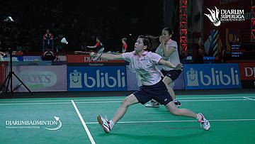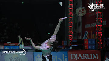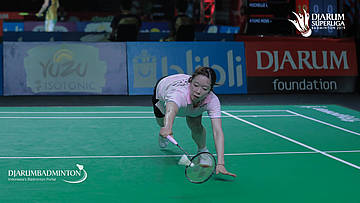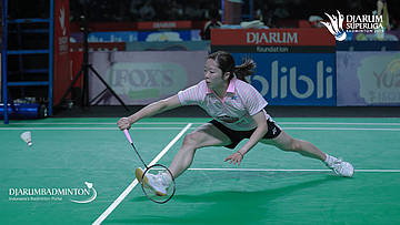 Michelle li (Djarum Kudus) mengembalikan shuttecock