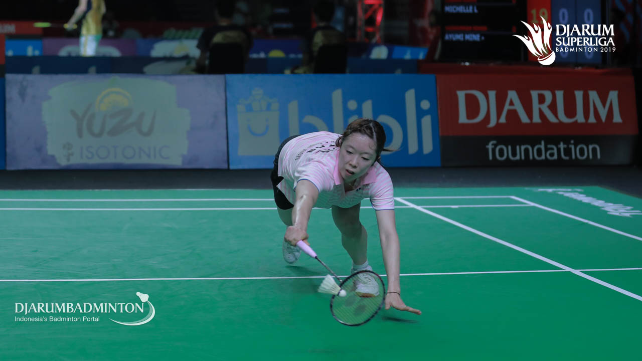 Ayumi Mine (Saishunkan Nihon Unisys) menggapai shuttlecock