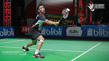 Keita MAKINO (HITACHI) (JAPAN) berusaha menggapai shuttlecock