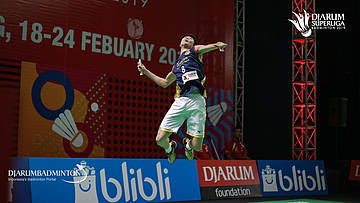 Rian ARDIANTO (JAYA RAYA JAKARTA) menyapa para pendukungnya seusai bertanding
