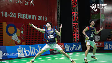 Angga PRATAMA+Muhammad Rian ARDIANTO (JAYA RAYA JAKARTA) mengembalikan shuttlecock