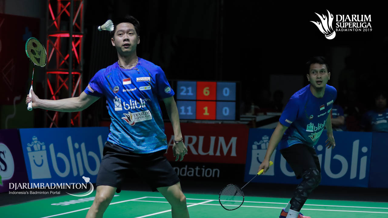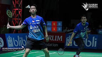 Kevin Sanjaya Sukamuljo/Mohammad Ahsan (Djarum Kudus) Menahan serangan