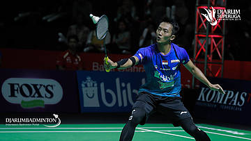 Ihsan Maulana Mustofa (Djarum Kudus) mengembalikan shuttlecock