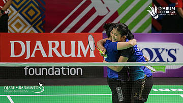 Maretha Dea GIOVANI+Yulfira BARKAH (MUTIARA CARDINAL BANDUNG) berpelukan usai memenangkan pertandingan