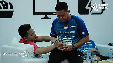 Ihsan Maulana MUSTOFA (DJARUM KUDUS) dan Shesar Hiren RHUSTAVITO (DJARUM KUDUS) saat berada di player lounge
