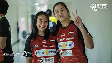 Febby Valencia Dwijayanti GANI+Lisa Ayu KUSUMAWATI (TIKET.COM CHAMPION KLATEN) berpose saat berada di player lounge