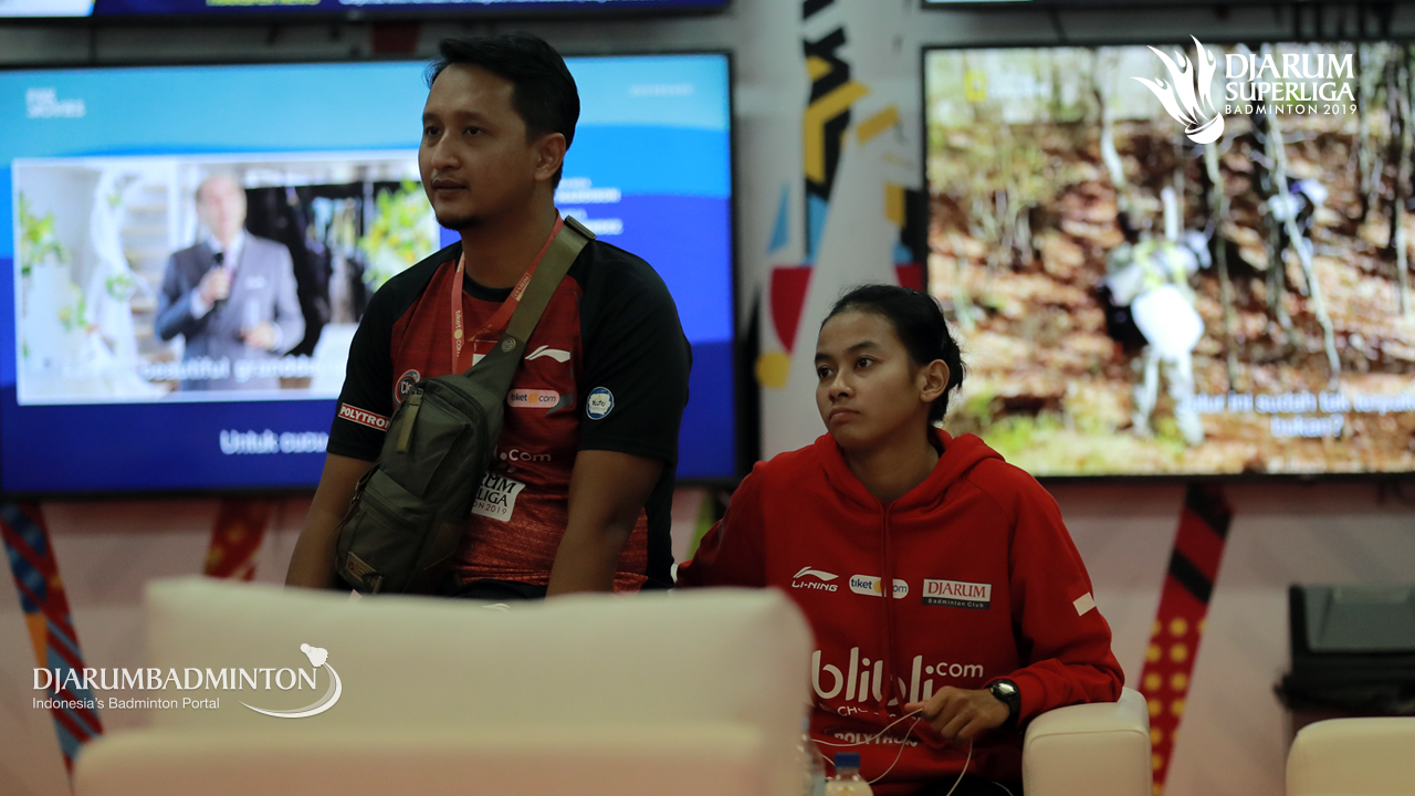 Dinar Dyah Ayustine (Djarum Kudus) bersama pelatih saat di player lounge