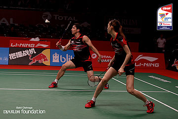 Tontowi Ahmad/Liliyana Natsir (INA) menahan serangan lawan