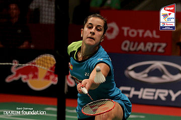 Carolina Marin (ESP) mengembalikan shuttlecock ke arah lawan