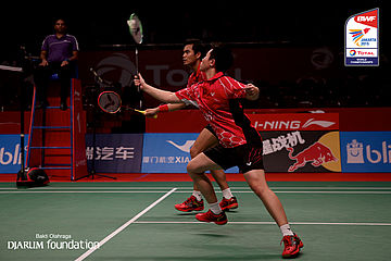 Tontowi Ahmad/Liliyana Natsir (INA) berusaha menggapai shuttlecock