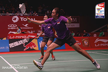 Keshya Nurvita/Devi Tika P (INA) mengembalikan shuttlecock ke arah lawan