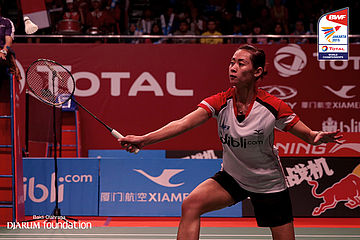 Maria Febe K (INA) mengembalikan shuttlecock ke arah lawan