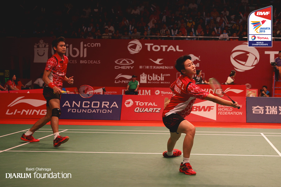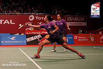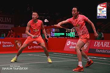 Tontowi Ahmad/Liliyana Natsir (INA) menahan serangan lawan