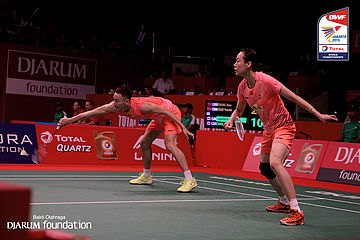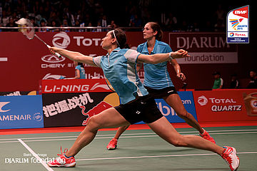 Zhang Nan/Zhao Yunlei (CHN) menahan serangan lawan