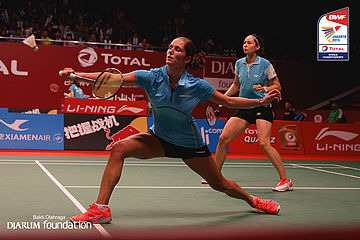 Johanna Goliszewski/Carla Nelte (GER) mengembalikan shuttlecock ke arah lawan