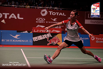 Maria Febe K (INA) berusaha menggapai shuttlecock