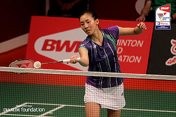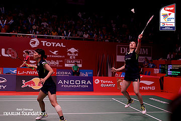 Reika Kakiiwa/Miyuki Maeda (JPN) menahan serangan lawan