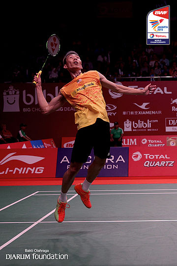 Lee Chong Wei (MAS) mengembalikan shuttlecock ke arah lawan