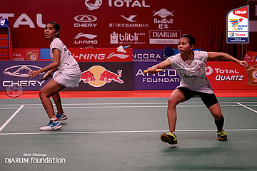 Nitya Krishinda M/Greysia Polii (INA) menahan serangan lawan
