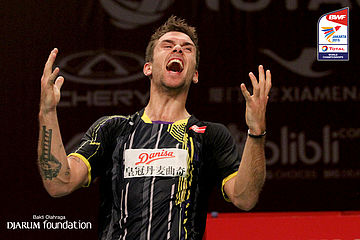 Ekspresi Jan O Jorgensen (DEN) saat memenangkan pertandingan