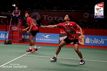 Mohammad Ahsan/Hendra Setiawan (INA) berusaha menyambar pengembalian lawan