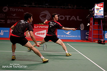 Lee Yong Dae/Yoo Yeon Seong (KOR) mengembalikan shuttlecock ke arah lawan