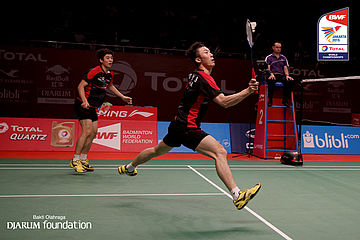 Lee Yong Dae/Yoo Yeon Seong (KOR) menahan serangan lawan
