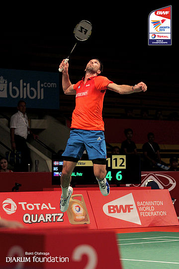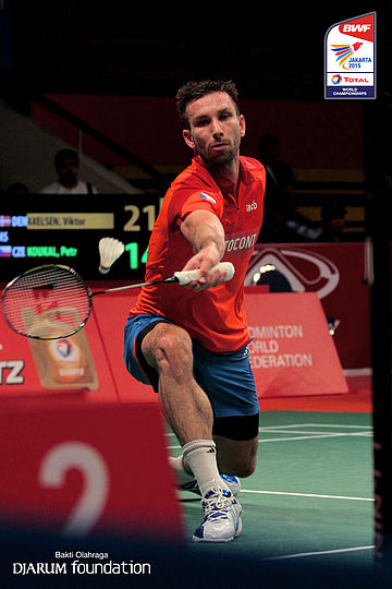 Petr Koukal (CZE) mengembalikan shuttlecock