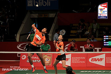 Edi Subaktiar/Gloria Emanuelle W (INA) menyambar pengembalian lawan