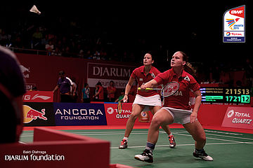 Samantha Barning/Iris Tabeling (NED) bersiap menyambut pengembalian dari Pia Zebadiah/Rizki Amelia (INA)