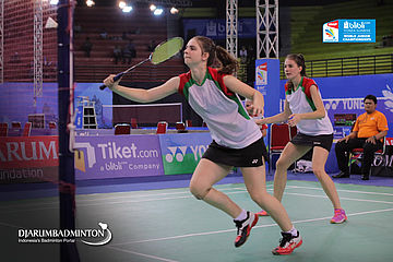 Maria Delcheva/Hristomira Popovska (Bulgaria) Mengembalikan Shuttlecock