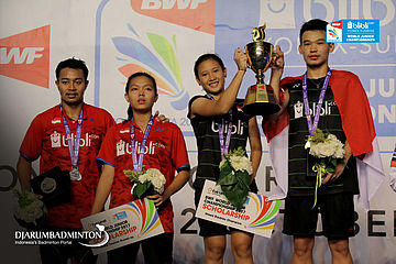 Rinov Rivaldy/Pitha Haningtyas Mentari (Indonesia) Berfoto di Podium Ganda Campuran