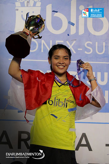 Gregoria Mariska (Indonesia) di Podium Tunggal Putri