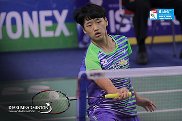 Moto Hayashi (Japan) Mengembalikan Shuttlecock Kearah Lawan