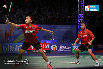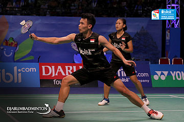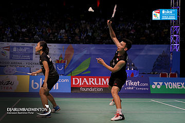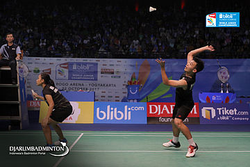 Rinov Rivaldy/Pitha Haningtyas Mentari (Indonesia) Mengembalikan Shuttlecock