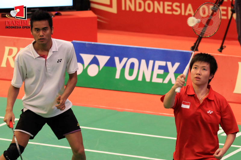 Pasangan ganda campuran Indonesia, Tontowi Ahmad/Liliyana Natsir tengah melakukan uji coba lapangan di Istora Senayan Jakarta.