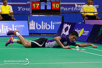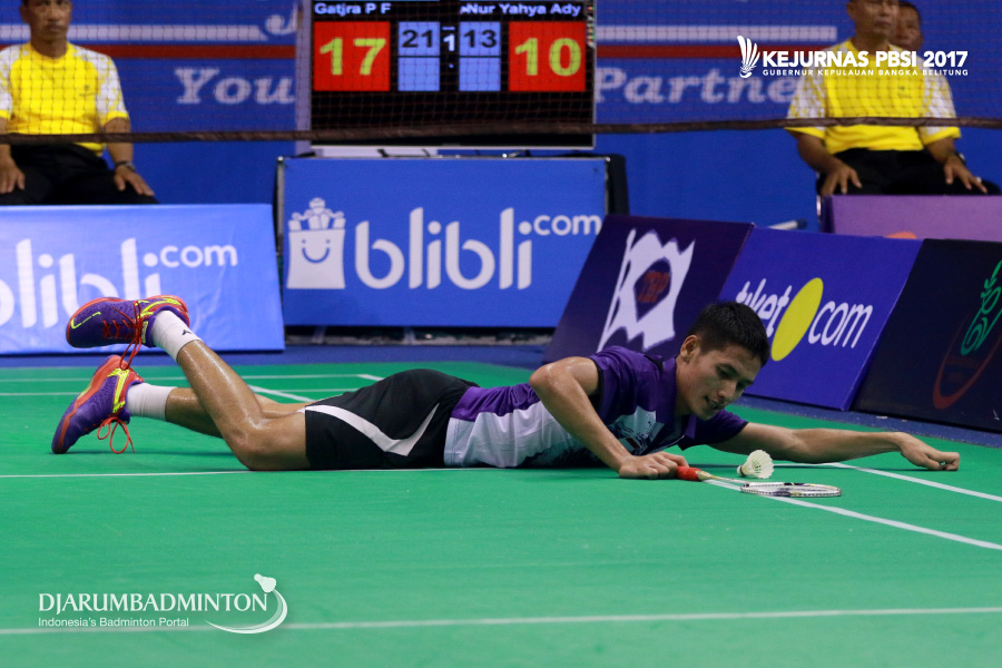Gatjra Piliang Fiqihilahi Cupu (DKI Jakarta) Terjatuh Saat Berusaha Menggapai Shuttlecock