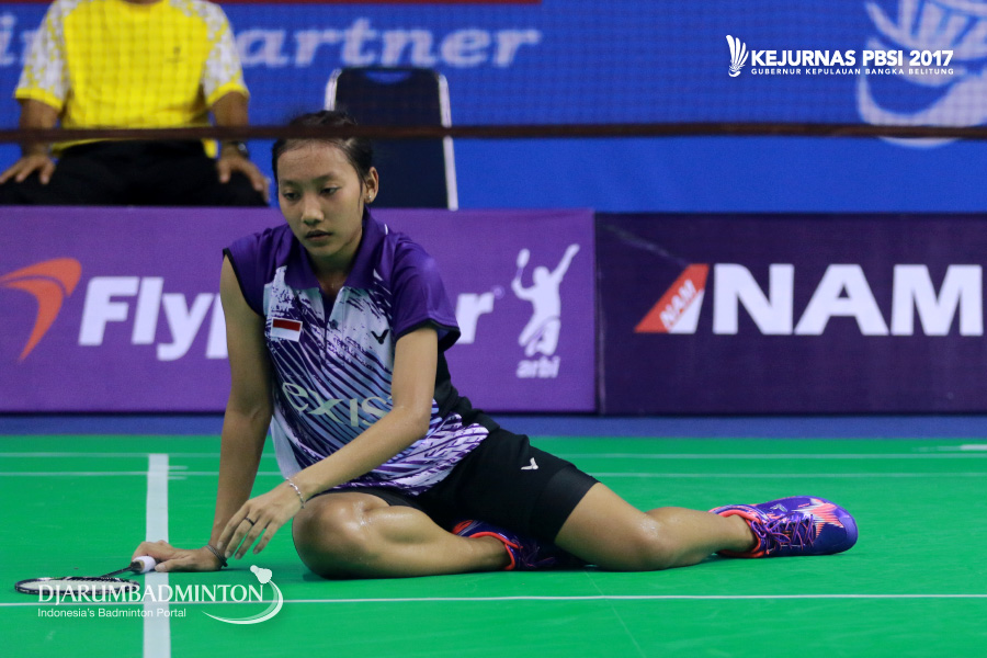 Bening Sri Rahayu (DKI Jakarta) Terjatuh Saat Berusaha Menggapai Shuttlecock